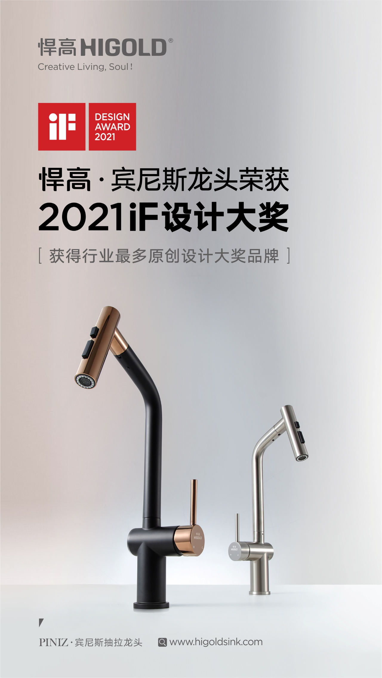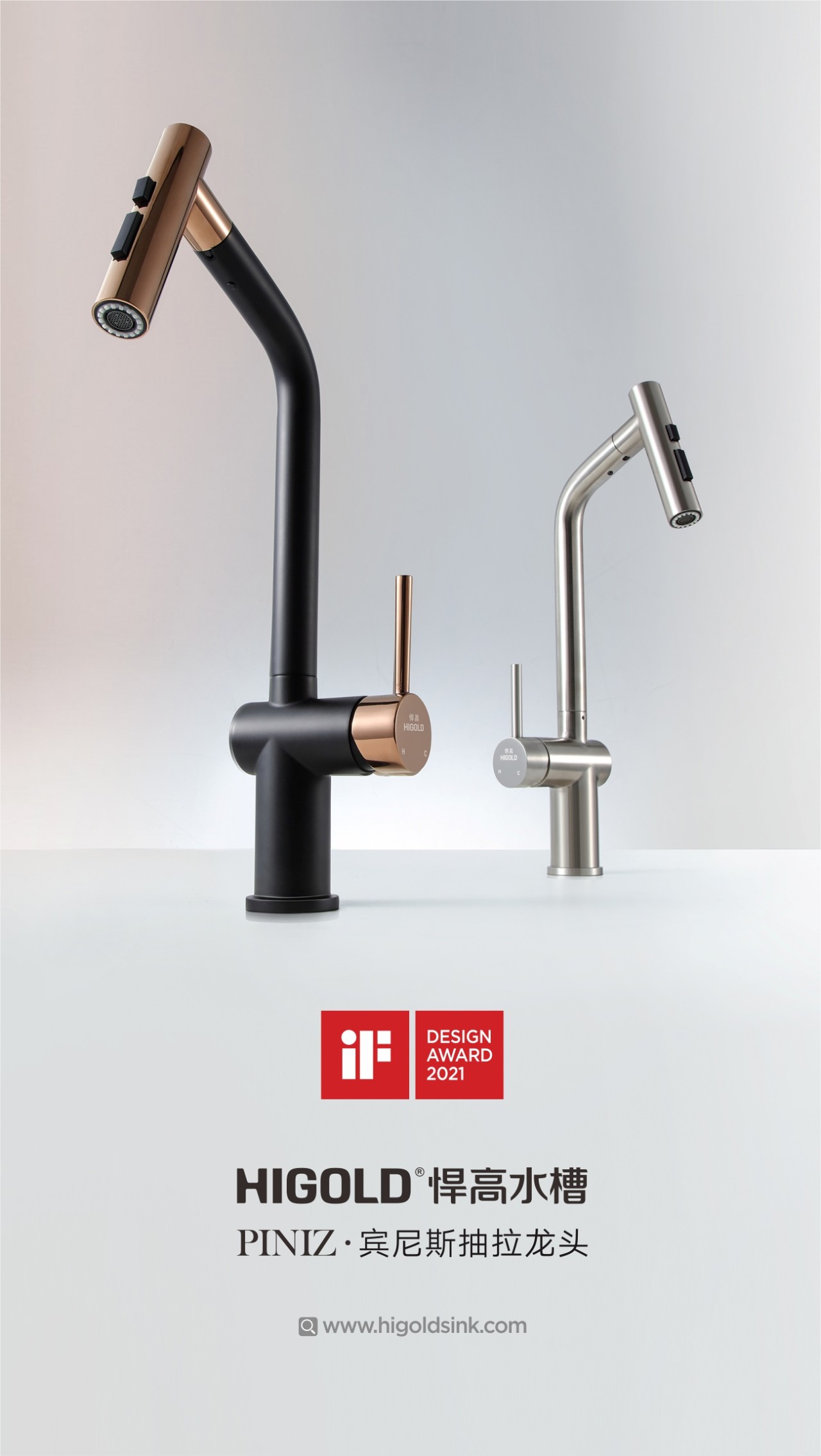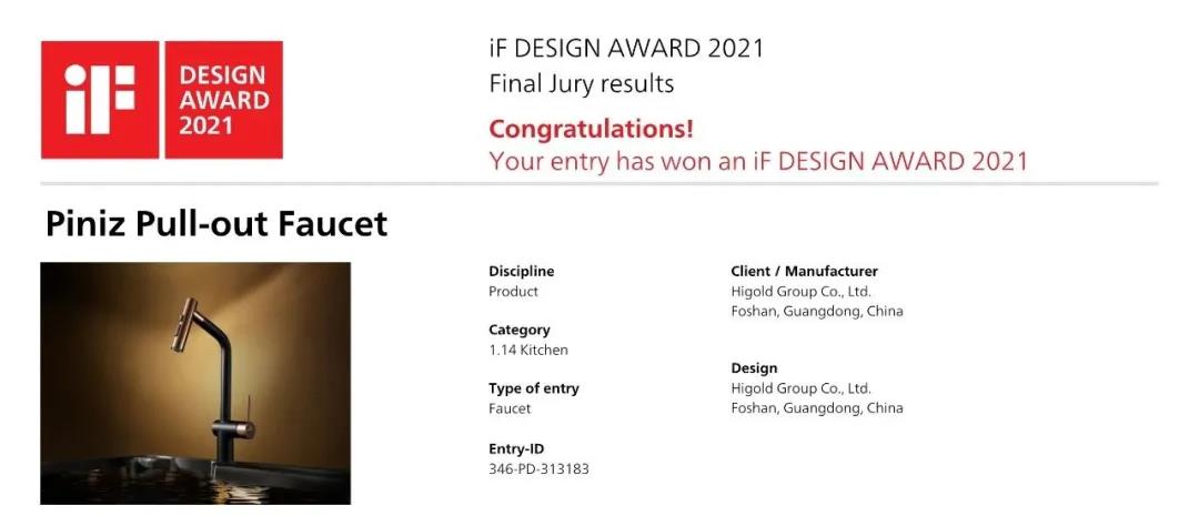 Другие продукты, отмеченные наградами, включают кран Higold Piniz. Этот смеситель был разработан итальянской командой дизайнеров Ferrari Pininfarina в сотрудничестве с Higold. Простые и мягкие линии, идеальная интеграция науки, технологий и дизайна передают изысканную красоту продукта.